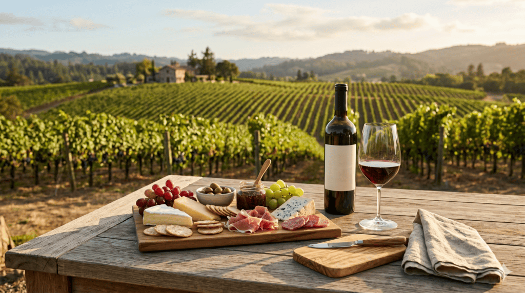 Think wine-friendly small bites: artisan cheeses, charcuterie, crackers, fresh fruit, olives, and something salty. Avoid messy or heavily sauced dishes that are hard to eat outdoors. Pre-cut everything at your accommodation to keep the on-site experience simple. Pair lighter foods (fruit, soft cheeses, salads) with Chardonnay or Sauvignon Blanc, and richer options (hard cheese, cured meats, roasted nuts) with Cabernet or Merlot.